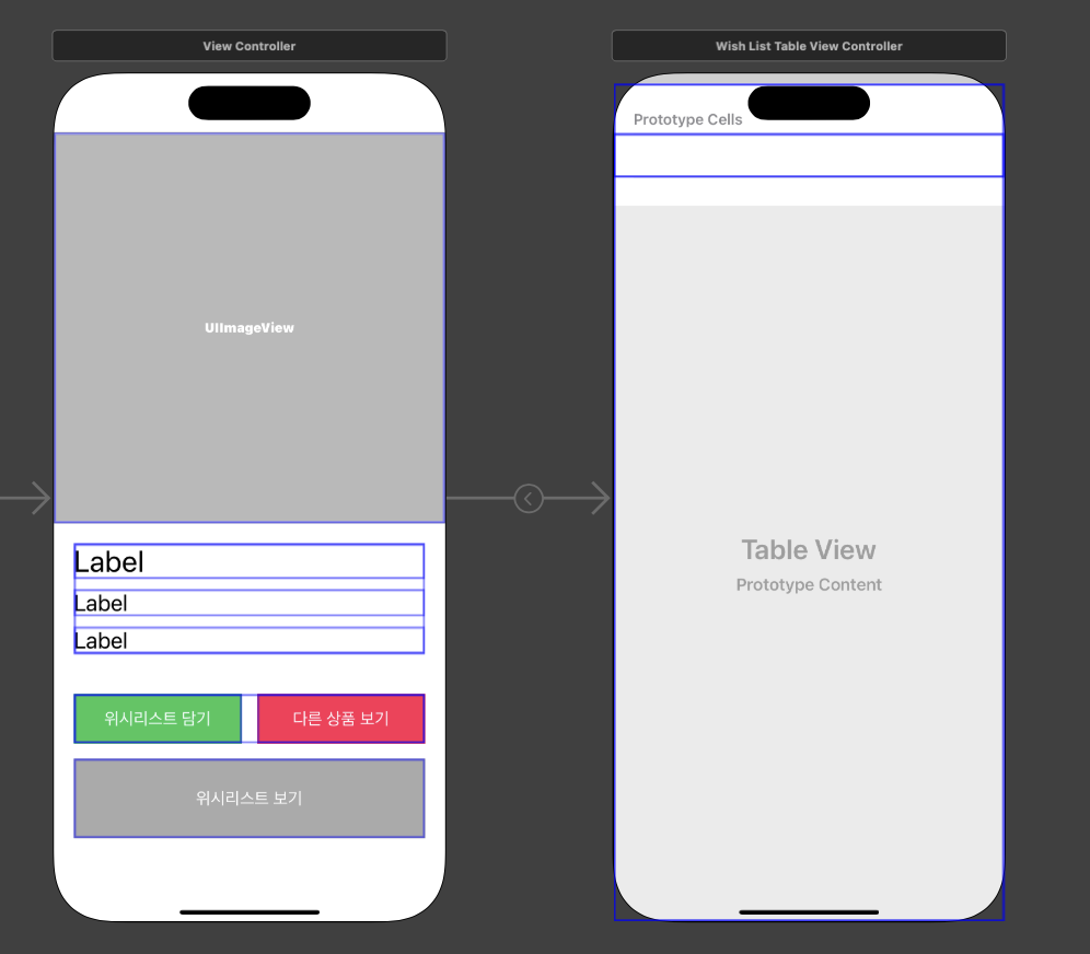 스토리 보드는 간단하게 API에서 받아와 제품이미지, 정보를 띄우는 VC와 원하는 위시리스트를 담아두는 테이블뷰를 사용할 VC로 구성했다.