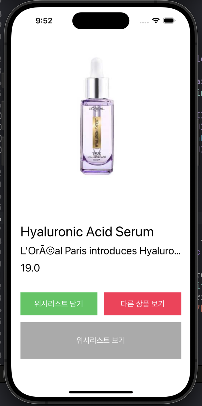첫번째 VC에는 위시리스트를 담는 기능과 다음 제품을 확인할 수 있는 버튼, 그리고 위시리스트로 이동할 수 있는 버튼을 구성했다.