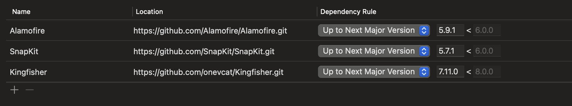 먼저 프로젝트를 선택하고 여기서 상단의 Package Dependencies 를 눌러 들어가면 이렇게 넣을 수 있는 곳이 등장한다.