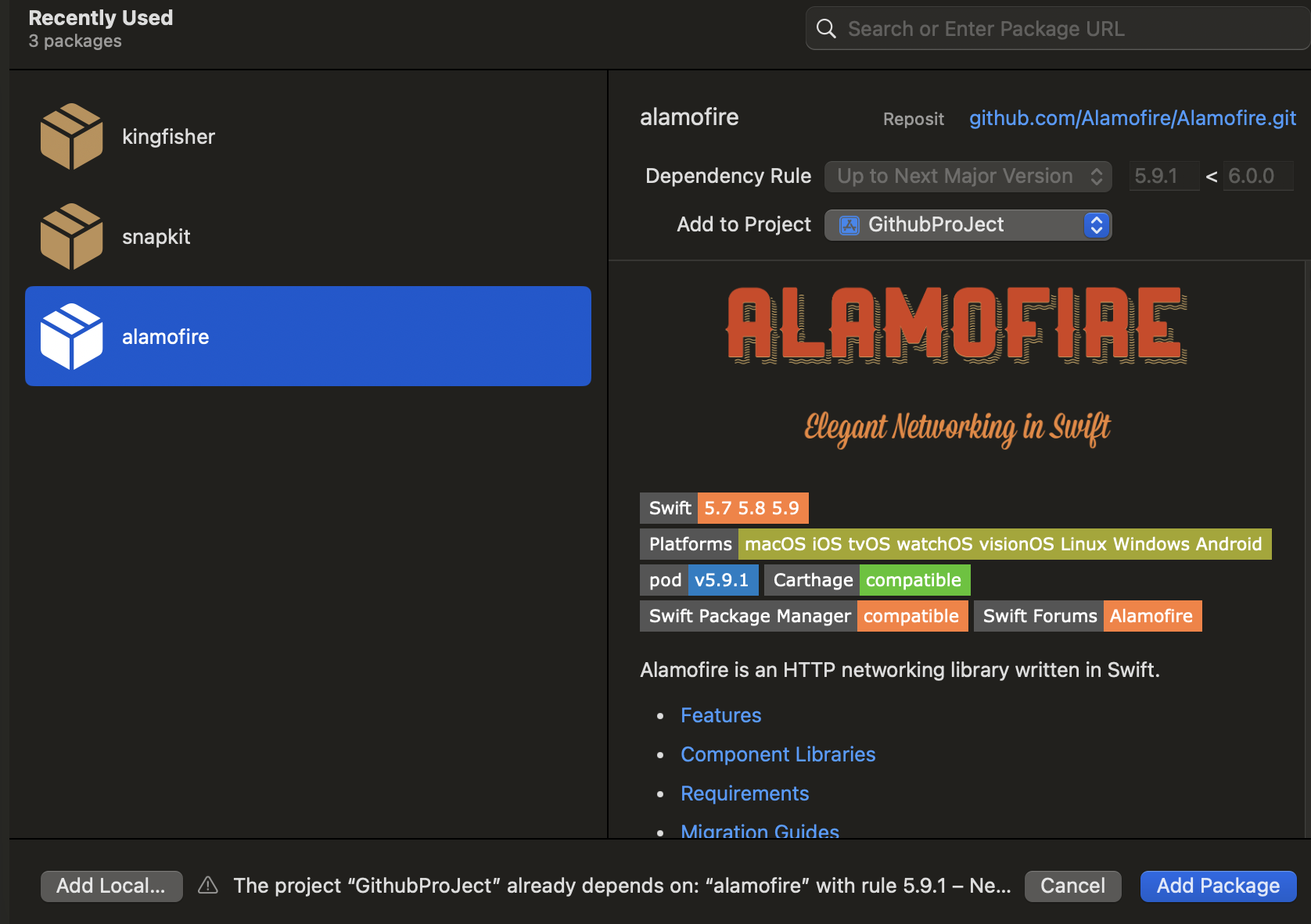 먼저 Alamofire를 사용하려면 내 프로젝트에 깔아야 사용이 가능하니 일단 먼저 깔아보자. 원래는 홈브루를 깔아 설치하는 방법을 사용 했는데