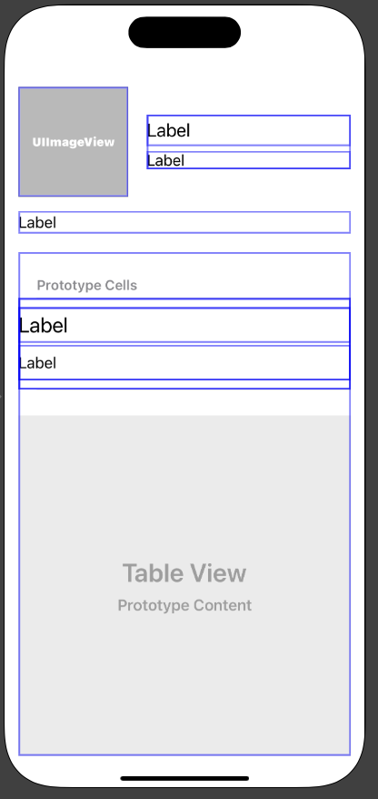 사진을 보면 스토리 보드에 테이블 뷰를 넣어두고 셀에 레이블을 넣어놨다. 이전에는 그냥 셀만 넣어두고 그 안에 레이블은 코드로 구현하는 경우가 많았지만 이번엔 그냥 귀찮아서 스토리보드에 구성을 하고 원래대로 register를 통해 셀을 연결했다.