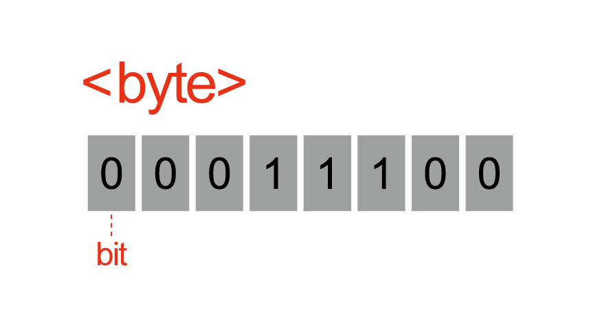 바이트는 여덟개의 비트가 모여 만들어진 것이다. 하나의 바이트에 여덟 개의 비트가 있고 비트 하나는 0과 1로 표현될 수 있기 때문에 2^8 = 256 개의 서로 다른 바이트가 존재할 수 있다.