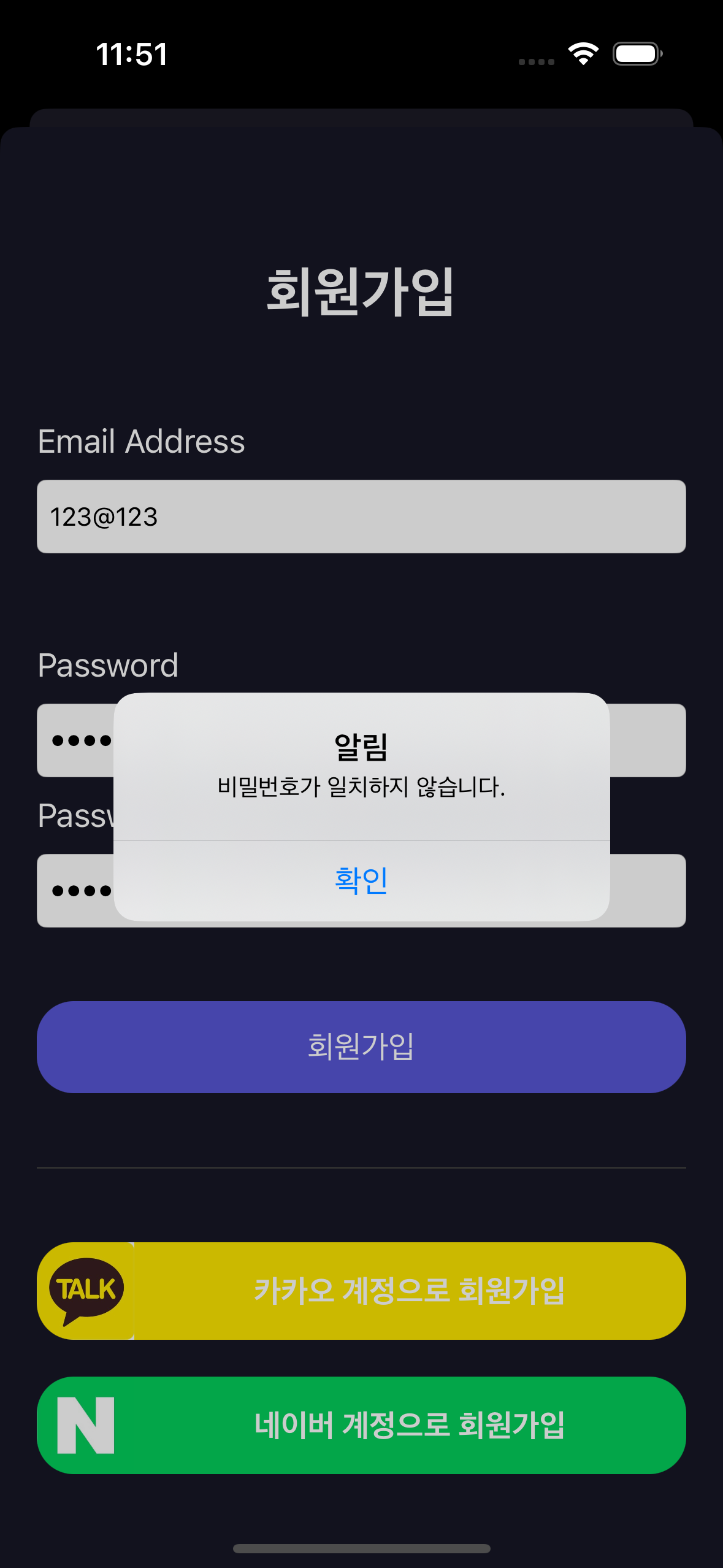 이때 패스워드가 일치하게 구성하였는지, 빈 텍스트필드가 없는지 등 여러 예외 처리를 이용자가 알 수 있도록 AlertController 를 활용해 안내할 수 있도록 구현했다.