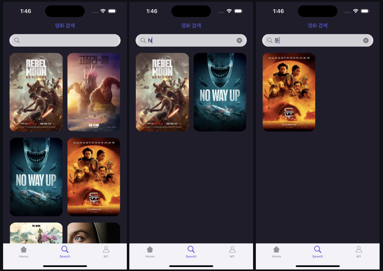 Search Bar 를 활용해 원하는 검색어를 입력하면 해당하는 영화가 검색 페이지 CollectionView 내 나타날 수 있도록 구현했다.