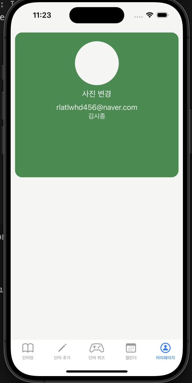 아직 단어가 들어오지 않아 일단 캘린더 쪽은 이정도 구현을 해두고 마이페이지 살짝 UI만 구성하고 오늘은 마무리!