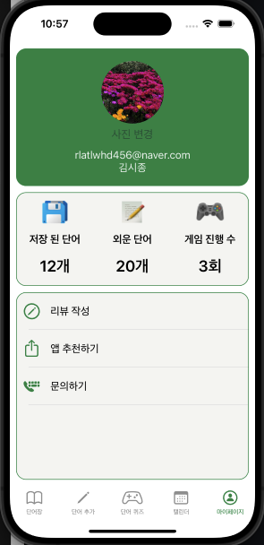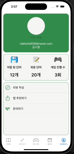 저장된 단어와 외운단어, 게임 진행 수와 같은 내용은 추후 코어데이터가 적용되면 코어데이터에 저장된 데이터의 count를 넣어 현재 저장되어있는 단어의 갯수를 파악 할 수 있도록 구현할 예정이다.