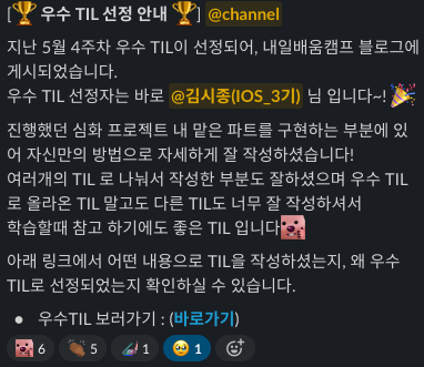 ㅎㅎ 이걸 바라고 TIL을 써온 건 아니지만 막상 받아보니 뿌듯하고 요즘 살짝 지치는 감이 없지 않았는데 다시 힘내서 갈 수 있는 동력을 얻은 것 같다!