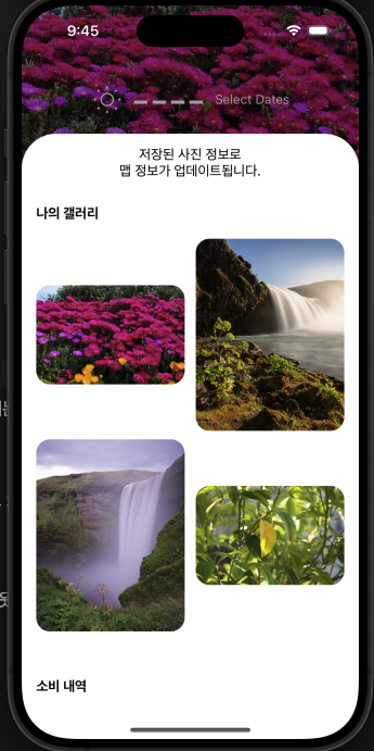아직 이미지가 들어오기 전이기 때문에 이미지가 들어올 부분에 검은 바탕의 이미지 뷰를 넣어두고 그 위에 view를 생성한 뒤 날짜 및 지역명이 나올 수 있는 스택 뷰를 올려주었다.
