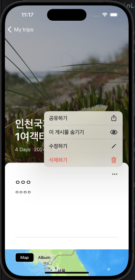 특정 핀로그를 수정하기 , 삭제하기 , 원하지 않은 게시물 숨기기 , 공유하기 등 여러가지 기능을 넣어보려고 한다.