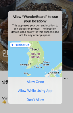 "NSLocationWhenInUseUsageDescription" = "이 앱은 사용자의 현재 위치를 파악하여, 사진 내 장소 정보를 핀으로 표시하는 기능을 제공합니다. 위치 정보는 이 기능을 제공하기 위해서만 사용되며, 다른 목적으로 사용되지 않습니다.";