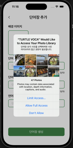 "단어장에 이미지를 추가하기 위해 사진 라이브러리에 접근하려고 합니다."