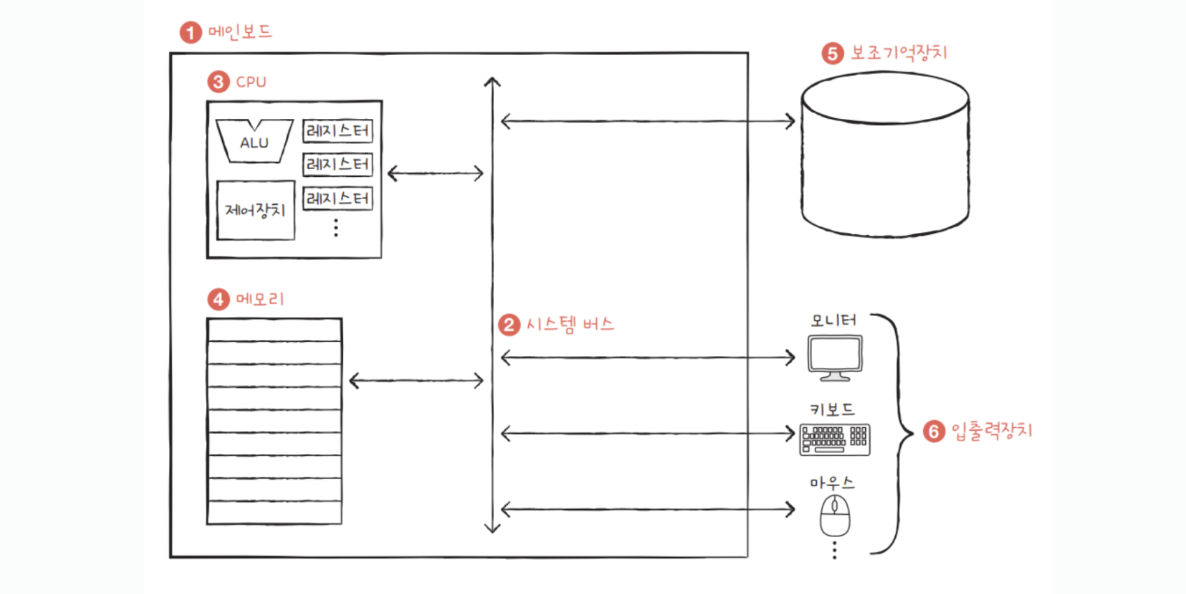- 컴퓨터의 4가지 핵심 부품 : CPU, 주기억장치, 보조기억장치, 입출력장치