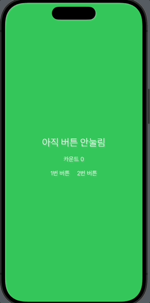 State로 지정해주었기 때문에 하단에 버튼을 눌러 값을 변경하는 코드를 넣어주면 이렇게 배경색과 카운트, 그리고 타이틀 문구가 변경되어도 잘 적용되는 것을 볼 수 있다.