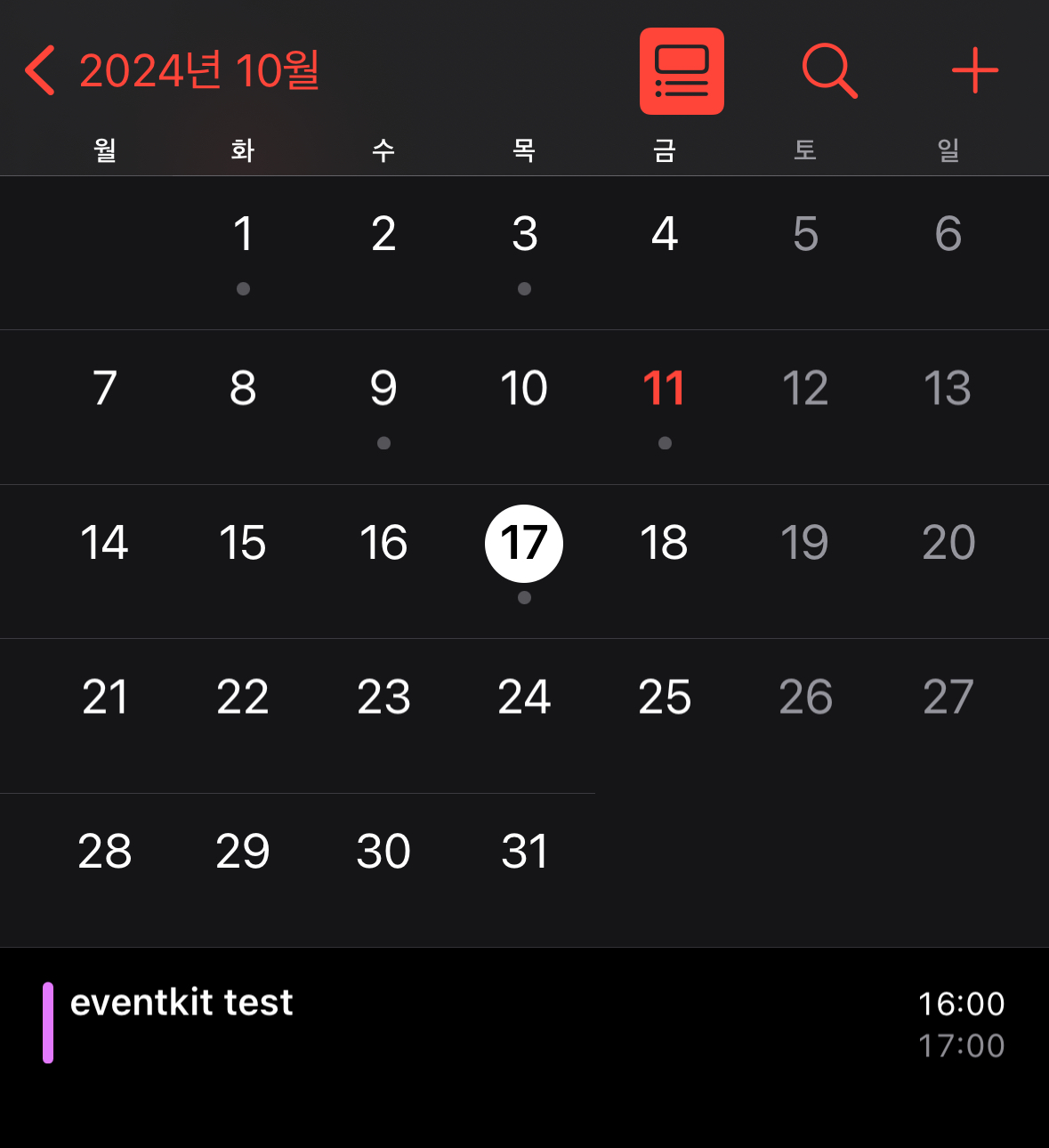 event의 제목 시작, 종료 등 일정의 정보를 넣어주고 defaultCalendarForNewEvents 를 설정해 새로운 이벤트가 설정될 기본 캘린더를 설정해준다. 그 이후 save(event, span: .tihsEvent를 활용해 캘린더에 해당 값을 저장하면 캘린더에서 추가하지 않아도 자동으로 일정이 추가되어있다!