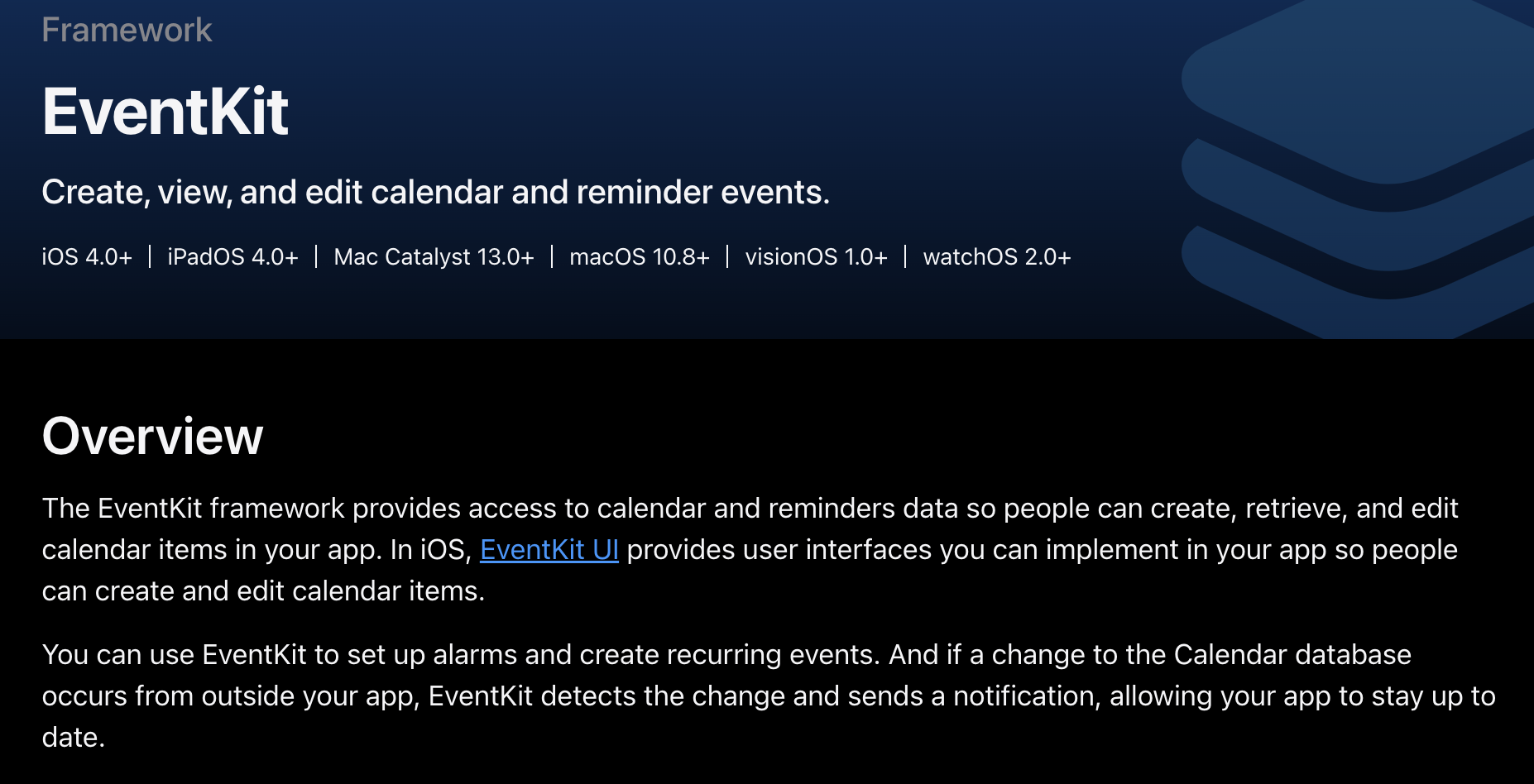 먼저 그렇게 하기 위해서는 EventKit을 사용해야하는데 이 EventKit 프레임워크는 사람들이 앱에서 캘린더 항목을 만들고, 검색, 편집할 수 있도록 데이터에 대한 엑세스를 제공한다.