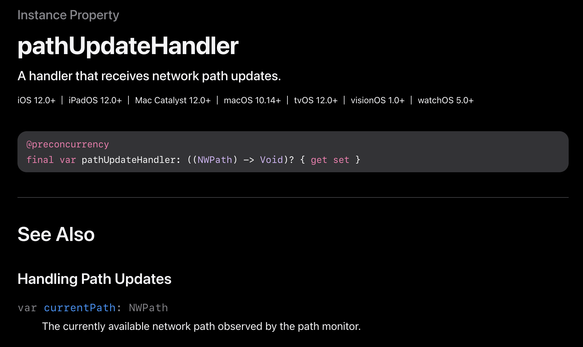 공식문서를 확인해보니 NWPathMonitor 내 pathUpdateHandler를 활용하면 현재 단말기의 네트워크 상태 값을 전달 받을 수 있다고 한다!