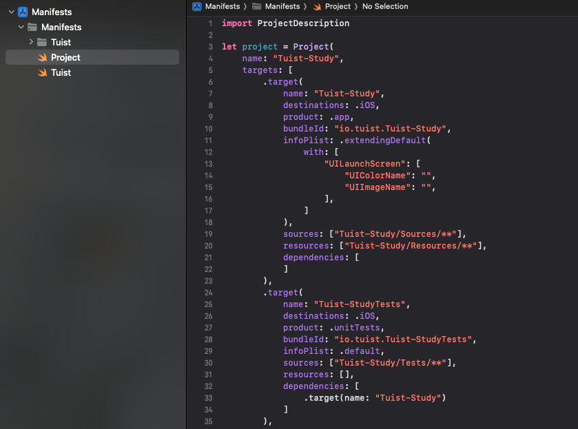 을 입력하면 매니페스트 파일인 Project.swift 파일이 열리게 되는데 이 매니페스트 파일은 코드 가반으로 프로젝트를 선언할 수 있게 해주고, 한 파일 내에 여러 타겟을 선언해 서로 간의 의존성을 명시할 수 있게 해준다.