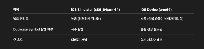 Duplicate Symbol Error는 환경에 따라 보이는 증상이 다르다. 그 이유는 시뮬레이터는 intel Mac, Apple Silicon 두 아키텍처를 지원하기 위해 멀티 아키텍처인 Fat 라이브러리를 빌드하는데 이때 두 아키텍처 모두에 대해 같은 소스가 컴파일 되고 링커가 두번 심볼을 병합하면서 중복 심볼 문제가 드러날 수 있다는 점!!