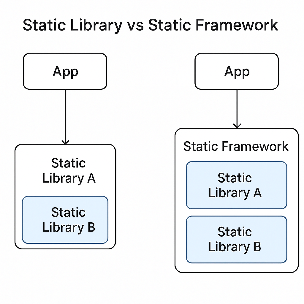 Static Library는 .a 파일로 여러 개가 링크될 경우 모든 심볼이 메인 바이너리에 포함되는 특징을 가지고 있지만 Static Framework는 내부적으로 Static Library와 리소스의 묶음 형태로 제공되기 때문에 링크될때 단일 단위로 링크되어 링커 입장에서는 재사용 가능한 하나의 독립된 블록! 이라고 볼 수 있다. 그렇기 때문에 중복 정의가 있더라도 한번만 병합 되도록 처리될 수 있다는 것!