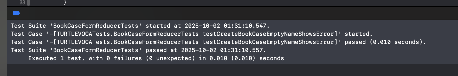 Test Case '-[TURTLEVOCATests.BookCaseFormReducerTests testCreateBookCaseEmptyNameShowsError]' passed (0.010 seconds).