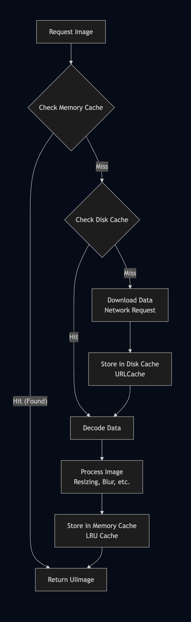 - Memory Cache Check - 가장 먼저 메모리(RAM)을 확인해서 있다면 바로 즉시 UIImage를 반환한다. (가장 빠른 방식)