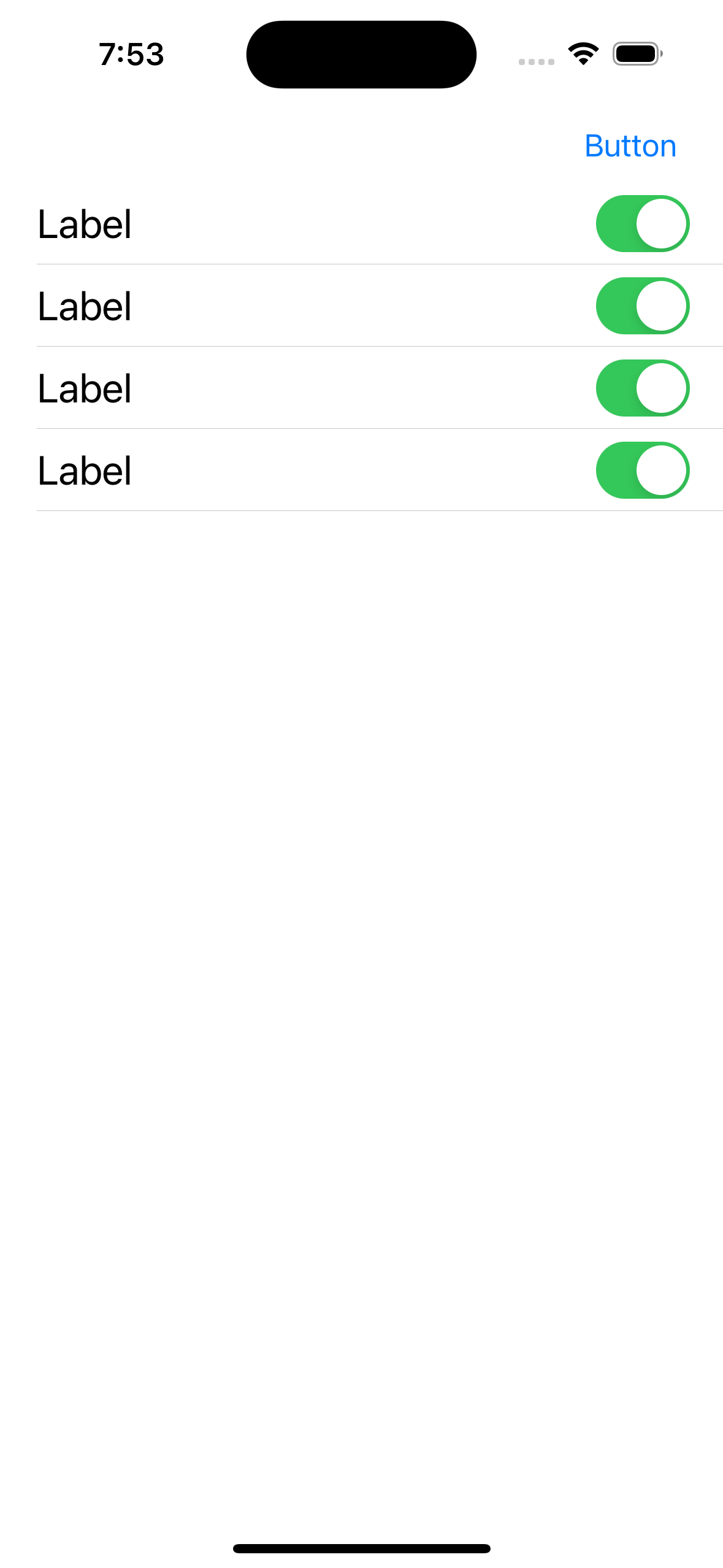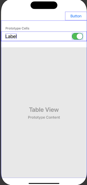 그 이후 TableViewCell 을 넣어 셀이 들어갈 위치를 잡아준 후, 그 안에 셀의 레이블과 스위치를 위치하고 오토레이아웃을 통해 Cell 중앙에 올 수 있도록 배치하였다.