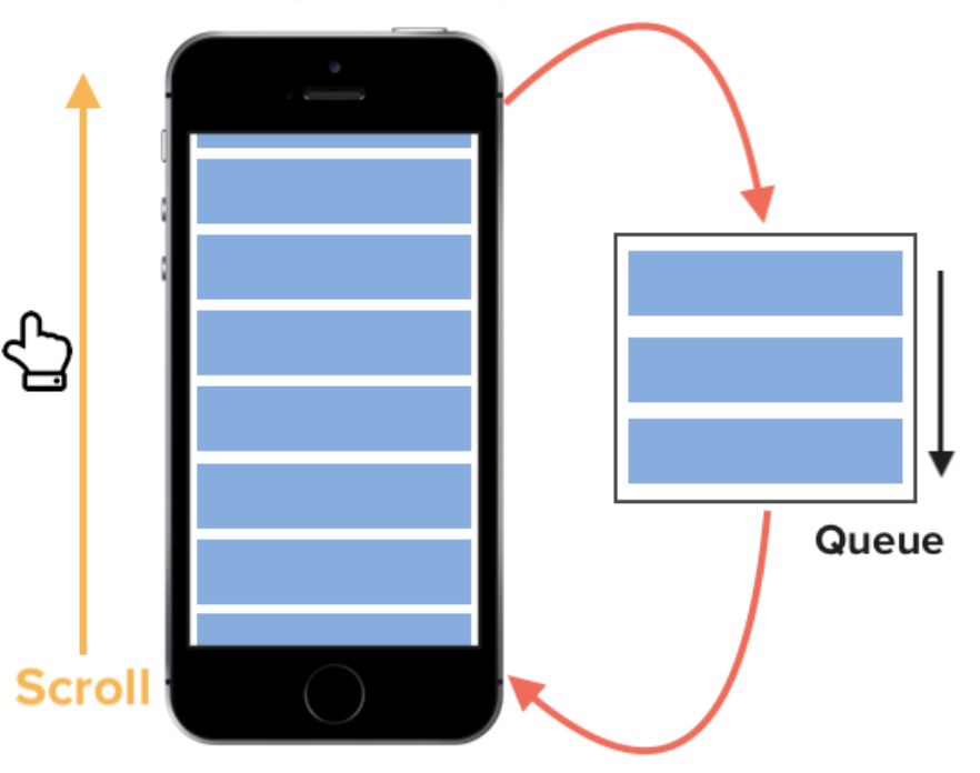 대신, 화면에 보이는 셀만을 메모리에 로드하고, 스크롤 시 화면 밖으로 사라진 셀은 재사용하게 된다.