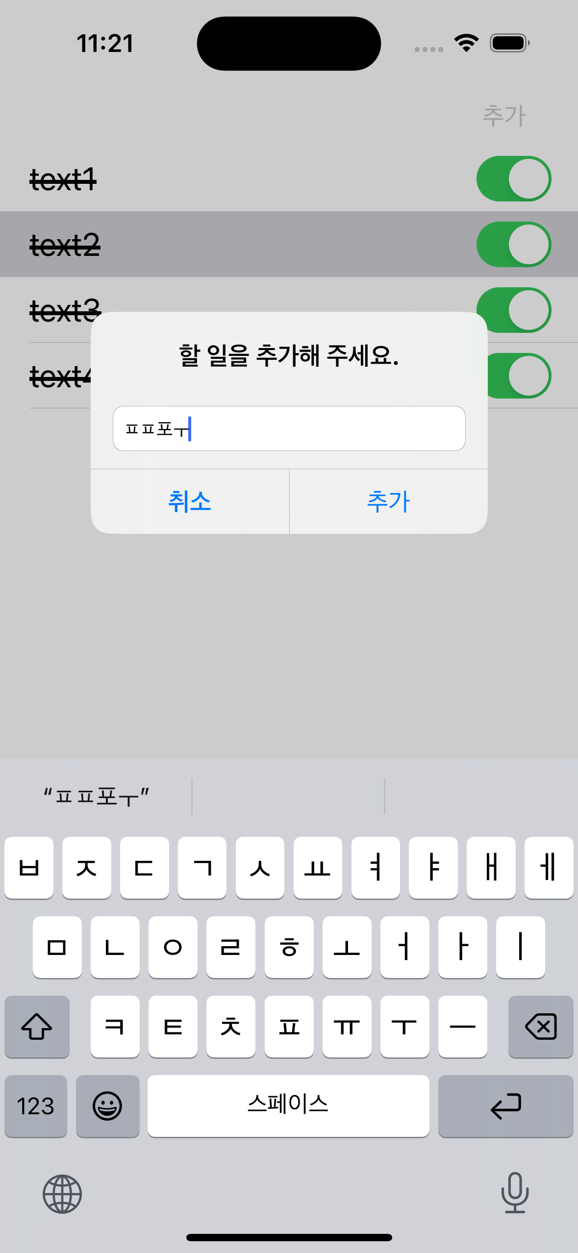 오늘은 버튼을 눌러 알럿을 띄우고 그 알럿 안에 텍스트 박스를 넣어 새로운 셀을 추가하는 기능과 Switch 버튼을 누르면 해당 일을 마친다는 뜻으로 취소선이 그어지는 기능까지 구현을 완료하였다.